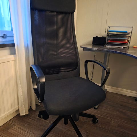 Säljer en modern och enkel skrivbord-/kontorstol som har gråmelerad dyna i tyg och svarta armstöd i syntetmaterial. Den är fin, skön att sitta på och knappt använd. Har stått på ett obemannat kontor.