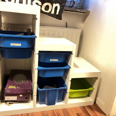 IKEA leksaksförvaring tvättkorg hopfällbar röd vit nät