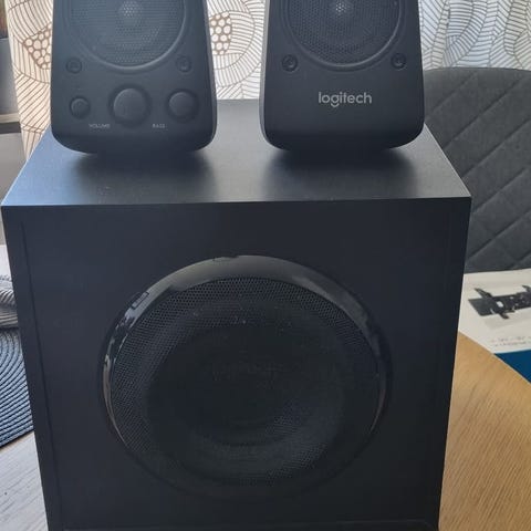 Logitech högtalarsystem med subwoofer. Systemet består av en subwoofer samt flera mindre satellithögtalare.