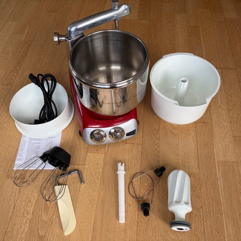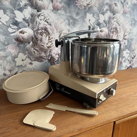 Electrolux Assistant köksmaskin i svart med skål och detaljer i rostfritt stål. Köksmaskinen är utrustad med två blandarskålar i rostfritt stål, stänkskydd samt flera tillbehör, bland annat ballongvisp, degkrok och flatblandare. Maskinen är avsedd för blandning, vispning och knådning av deg och smet i hushållet. Passar för bakning, matlagning och förberedelse av olika typer av degar och röror. Den är bara använd några gånger. Skålarna är på 2,9 och 4,8 l. Orginalkartongen finns men är lite trasig. Säljes för 1600kr eller högstbjudande först till kvarn.