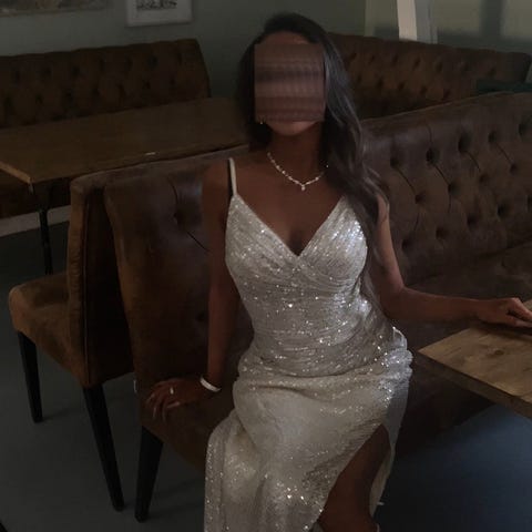 Klänningen är elegant med vackra paljettdetaljer som ger en lyxig känsla.