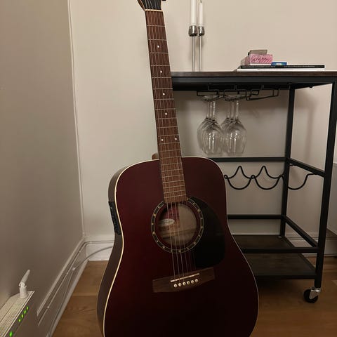 Inkluderar gitarrfodral, plektrum, capo, gitarrställ som syns på bild.