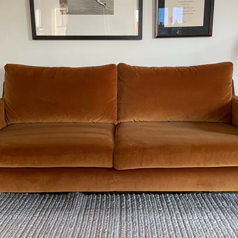 Mio soffa i röd sammetstyg. Soffan har två sittdynor och två ryggkuddar samt smala armstöd. Ben i mörkt trä med metallfärgade avslut. Passar som sittmöbel i vardagsrum eller liknande utrymme.