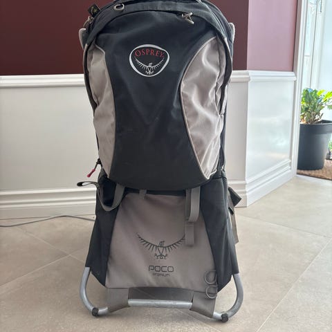 Osprey poco ag plus, med solskydd och regnskydd, inte mycket använd. Mkt fint skick.