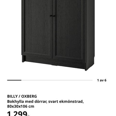 Jag säljer två IKEA Billy Oxberg dörrar med silver knoppar. En dörr mäter 40x97 cm.