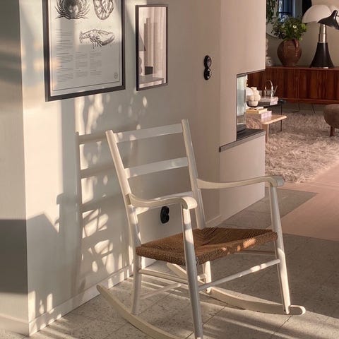 Säljer en gungstol inspirerad av Eames. Vit sits i formgjuten plast med kromade metallstag.