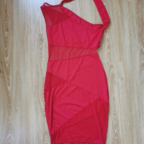 Misslook party-/cocktailklänning för dam i storlek S. Klänningen är röd och tillverkad i polyester. Framsidan har en panel med paljetter och dekorativa detaljer upptill vid axelbanden. Modellen är figurnära med dragkedja bak. Passar som fest- eller cocktailklänning.
