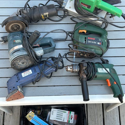 Blandning av elverktyg från Bosch och Hilti med tillbehör. I bilderna syns bland annat sticksåg, borrmaskin/skruvdragare, bilnings- eller borrhammare samt olika tillbehör som batterier, laddare, borrar och mätverktyg i respektive plastväska. Verktygen är nätdrivna och batteridrivna beroende på modell. Lämpliga för olika typer av bygg-, renoverings- och installationsarbeten där sågning, borrning och bilning behövs.
