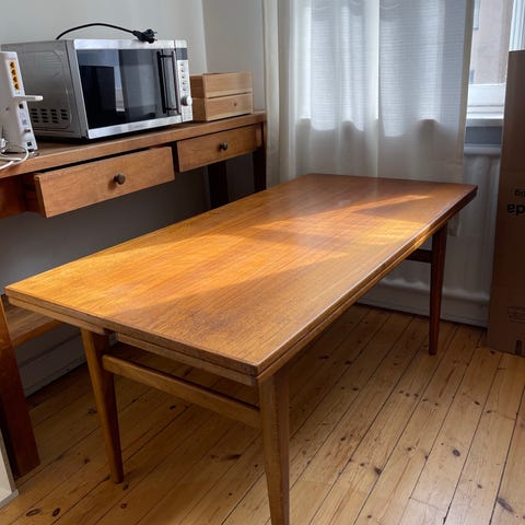 Uppfällbart soffbord i teak med hylla. I fantastiskt skick. Säljes på grund av flytt.