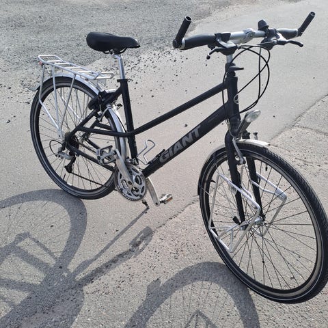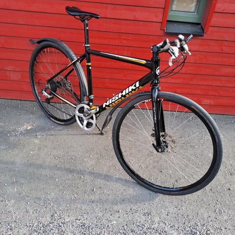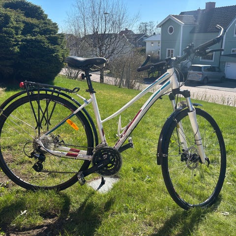 Merida hybridcykel för kvinna med ramstorlek XS (ca 46 cm) och 28" hjul. Cykeln har vit ram med lågt insteg och är utrustad med skärmar bak och fram. Hybridutförandet gör den lämplig för både vardagscykling och längre turer på blandat underlag. Sittställningen är relativt upprätt och passar för bekväm pendling och fritidscykling i stad och på landsväg.