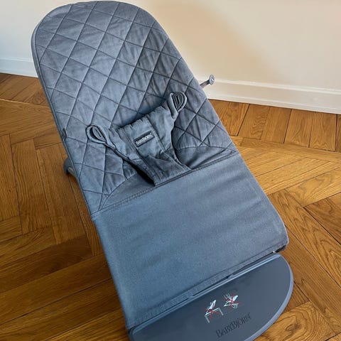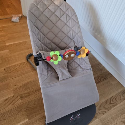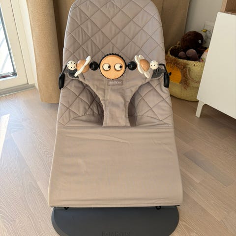 Babybjörn babysitter barnstol i beige tyg med quiltat mönster. Stolen har justerbar lutning och är monterad på en stabil metallram. På bygeln framtill sitter en avtagbar leksaksbåge med trädetaljer. Nytvättad i parfymfritt tvättmedel, redo att användas.