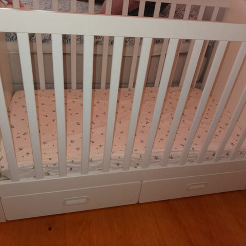 Sängen är 95x48x80 cm och kan placeras intill en vuxensäng och användas som Bedside crib eller fristående i rummet.