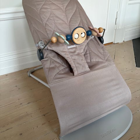 Babybjörn barnstol med mjuk sits i textil Stolen har en leksaksbåge framtill med färgglada figurer som barnet kan titta på och greppa. Lämplig som sitt- och vilostol för små barn i hemmet. Lite nopprig i tyget tyget är helt