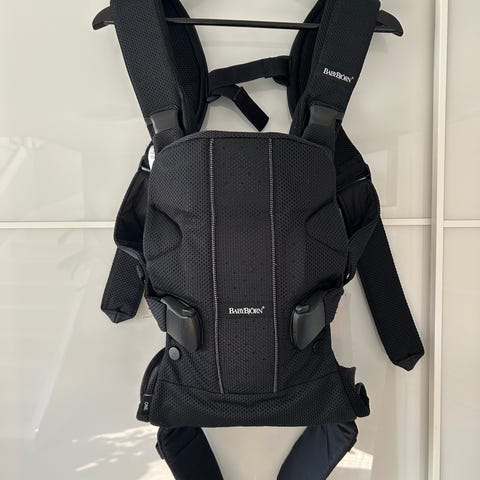Säljer en Babybjörn bärsele i bra skick. Selen har justerbara axelremmar och midjerem för att passa olika bärare. Invändig etikett visar instruktioner för hur barnet kan bäras i olika positioner.