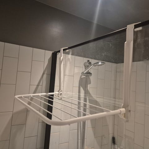 Tvättställ eller handdukstork i akaciaträ. Den är hopfällbar för enkel förvaring när den inte används.