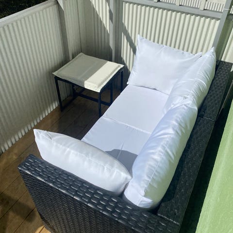 Bänksoffa i konstrotting med integrerat bord i mitten. Möbeln har två sittplatser med separata ryggstöd och lösa sittdynor i ljus färg. Passar för utomhusbruk på exempelvis altan, balkong eller uteplats.