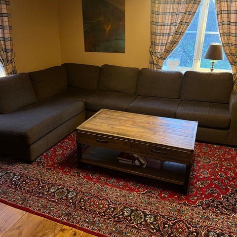 Stor soffa som tar många. Ena sidan katt-klösmärken. Passar inga finrum men perfekt för tonårshäng, övernattningar och spelkvällar.