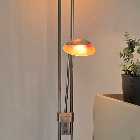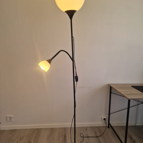 Golvlampa i metall (uplight) med separat läslampa. Lampan har två ljuskällor: