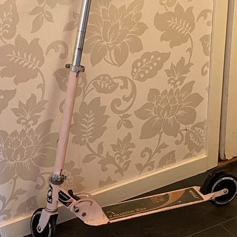 trehjulig sparkcykel i gul och rosa färg. Sparkcykeln har tre hjul för extra stabilitet, två bakhjul och ett framhjul. Finns lite repor !