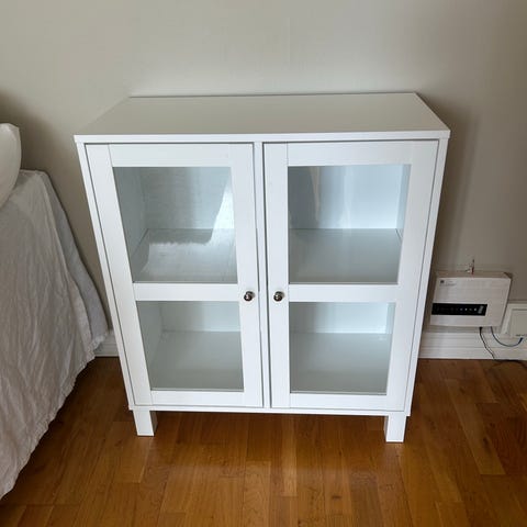 Lågt vitt skåp/byrå med två hyllplan och två dörrar.