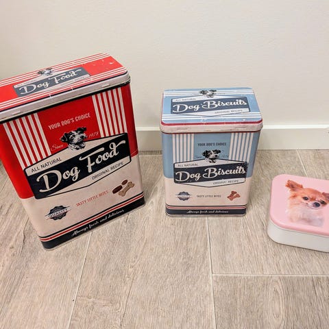 Burk i plåt utformad som ett ben med tryckt hundmotiv på locket och sidorna. Passar till förvaring av till exempel hundgodis, småsaker eller andra torra varor i hemmet. Flerfärgat motiv med flera olika hundar mot ljus bakgrund. Felfritt skick