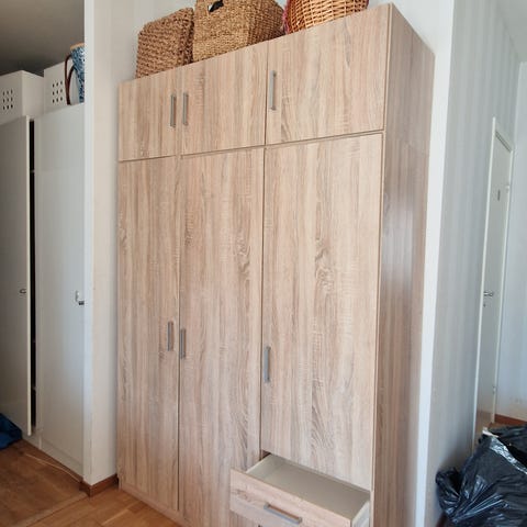 Jysk garderob i vit och träfärgad laminat. Garderoben har tre dörrar med handtag i metallfärg. Invändigt finns en klädstång för galgar samt öppna hyllplan på ena sidan för förvaring av till exempel skor, väskor eller vikta kläder. Nertill finns tre utdragbara lådor för extra förvaring.