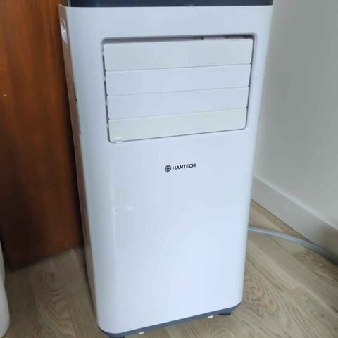 Portabel luftkonditionering i vit färg. Enheten har digitalt kontrollpanel på ovansidan med display och knappar för olika lägen och timerfunktion. På baksidan finns anslutning för slang samt kabelupphängning. Medföljande tillbehör enligt bild inkluderar luftslang och fönster-/vägganslutning. Lämplig för inomhusbruk för kylning av rum där fast installerad luftkonditionering saknas.