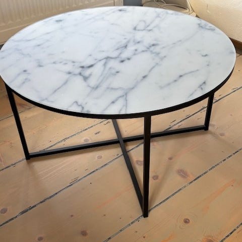 Venture home soffbord, runt glasbord med marmorinslag i designen.