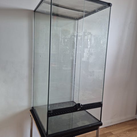 TERRA-PLUS terrarium, 120x60 med glasdörrar och inbyggd belysning. Terrariet har skjutdörrar i glas på framsidan och står på ett bord som medföljer. Invändigt finns en gren för klättring samt armatur (keramisk sockel) för värme- och UV-lampa. På sidan finns genomföring för kablar eller ventilation. Passar för exempelvis reptiler eller andra terrariedjur där behov finns av värme och ljus. Exo Terra Solar Glo-lampa syns på bild, medföljer men har ca 7 månader på nacken så UV-ljuset är reducerat men funkar och ger bra värme, 80W.