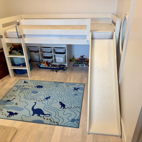 IKEA loftsäng för barn med integrerad garderob och skrivbord. Sängen är upphöjd med stege på kortsidan. Under sängen finns en garderobsdel med klädstång och hyllplan samt ett skrivbord med förvaringslådor. Mått enligt bild: totalhöjd cirka 182 cm, längd cirka 205 cm och bredd cirka 104 cm. Passar i barnrum där man vill kombinera sovplats med förvaring och arbetsyta.