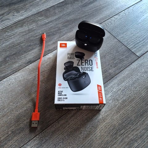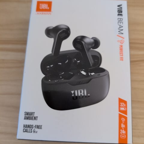 Komplett med låda, laddsladd, extra öronpuffar och manualer.