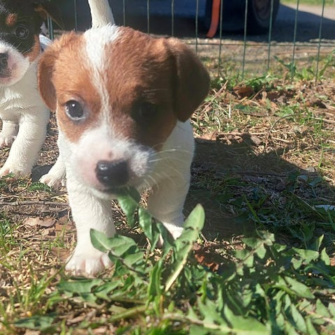 Här har vi Mjölkis, en 7 veckor gammal jack russell-hane, som söker sitt eget hem tidigast 23 april.