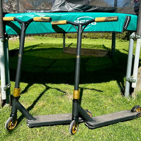 Två sparkcyklar i trickmodell med svart styre och färgade handtag i gult och grönt. SX100 med gula handtag är köpt på XXL för 999kr - se länk. Den med gröna handtag är köpt på nätet för 730kr. Bägge är använda men fungerar utmärkt. Pris är prutat och klart.