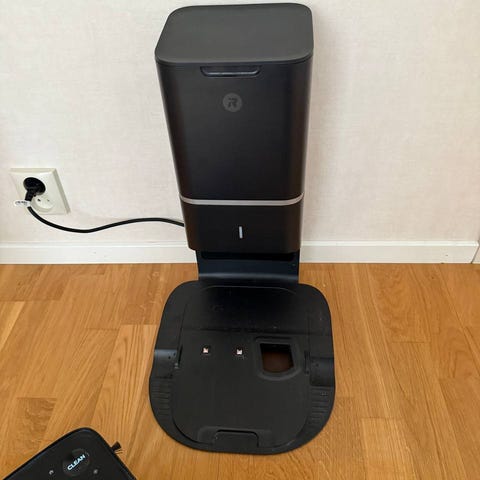 Undersidan har sidoborste och borstsystem anpassat för damm och smuts på golv. Laddstation med nätkabel ingår för automatisk laddning när dammsugaren dockar.