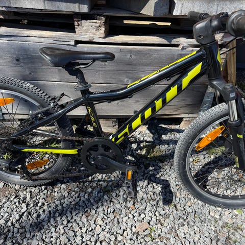 Svart-gul: Scott speedster 24”. Fin och pålitlig. Sonen har aldrig klagat på något. Bra komponenter. Perfekt på asfalt och grus. Passar 140-150cm 2200kr