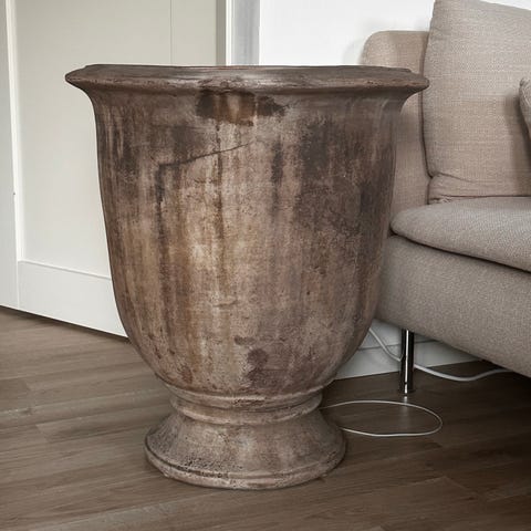 Vackra krukor i lergods med lejonornament i vit och sandfärgad yta . Reproduktion av en Italiensk förebild . Klassisk utformning med reliefdekor och fyrkantig fot. Passar för plantering av växter både inomhus och utomhus. Krukorna