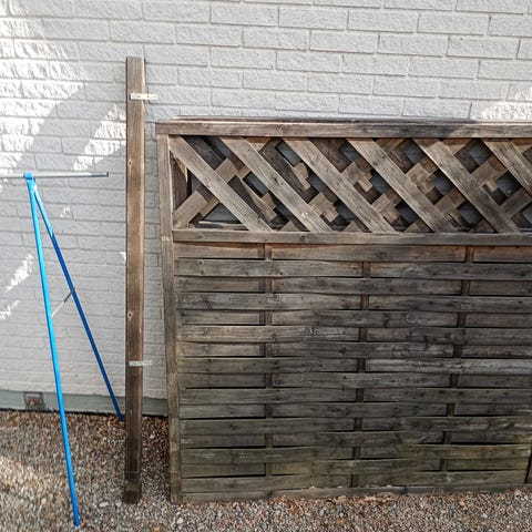 Trä staketsektioner med överdel i spaljé, brunlaserat trä. Sektionerna består av horisontella brädor i nedre del och rutmönstrad spaljé i övre del. Passar som insynsskydd, avgränsning av tomt eller inramning av uteplats och trädgård. Monteras mot stolpar med markfästen enligt bilderna. 4 stor 190 l b 180. 2 små 100 cm