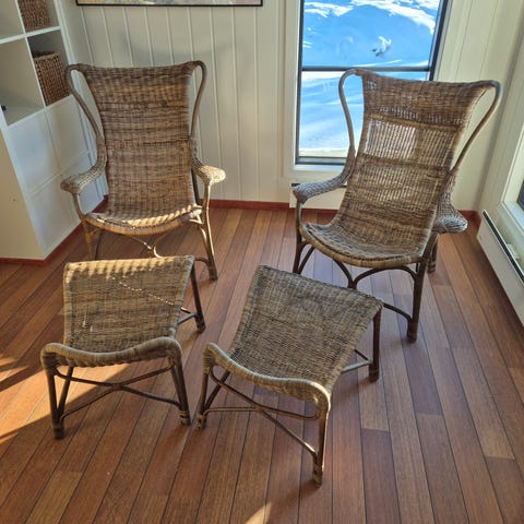 Den händige sprutlackar/laserar eventuellt fåtöljerna. De är stadiga. Sitthöjd 40 cm. Man får till ett bra pris två fåtöljer dyra att köpa nya. Billigaste nypris för dessa f n är 4586 kr/st. 3800 kr för båda.