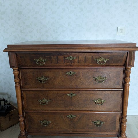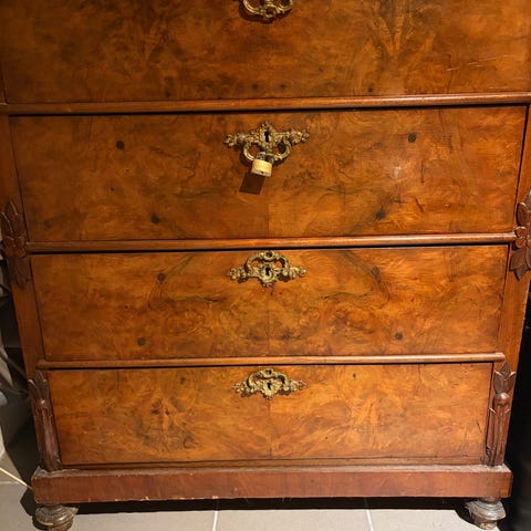 Äldre byrå , alla lådor fungerar o är hela. Lite slitage på ovansida.