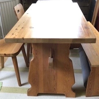 Furumöbel, stabila med vissa skönhetsmärken men som går o slipa om man vill.