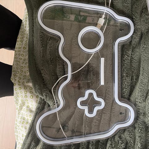 Joystick Neon vägglampa blå. Två meter lång sladd. På sladden sitter det en dimmerbrytare som man kan tända och släcka lampan med. Samt att vrida upp och ner ljuset. Sladden är USB som man kopplar in i en vanlig USB adapter. Lampan är ca 45 cm bred och är tillverkad med flerfärgat neon. Kan hängas på väggen med två spikar eller skruvar. Ger ett mysigt ljus