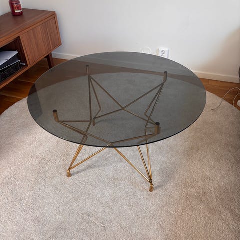 Mio soffbord med rund bordsskiva i glas och underrede i metall. Bordet har ett stjärnformat stativ med hjul längst ned på benen. Passar som soffbord eller vardagsrumsbord.