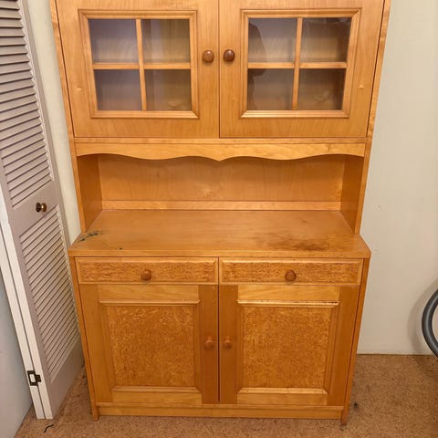 Hörnskåp i trä med överskåp och underskåp. Överskåpet har glasdörr med spröjs och hyllplan för förvaring eller exponering av porslin och andra föremål. Underskåpet har trädörr med vertikala ribbor och utrymme för dold förvaring. Skåpet är utformat för att stå i ett hörn och passar i kök, vardagsrum eller matsal.
