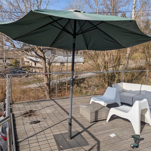 Förvaras i uppvärmt förråd. Har aldrig haft det ute mer än några timmar när solen skiner.