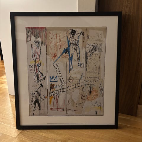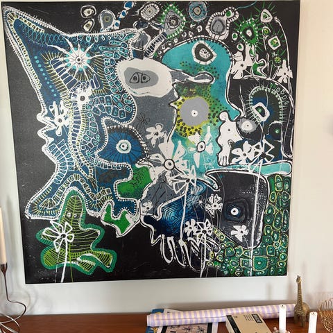 Tavla med abstrakt motiv av siluetter av människor mot ljus bakgrund. Flera av figurerna bär färgade detaljer som skapar ett mönster över hela ytan. Passar som väggdekoration i exempelvis vardagsrum, hall eller kontor. Material och exakta mått är okända utifrån tillgänglig information.
