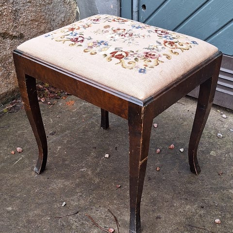 En läcker klädd retropall, ca 1940-50 tal. Sitsen/locket öppningsbart vilket gör den till en inte bara snygg utan även en praktisk förvaringsmöbel. Klädseln är original men kan kläs om om det är önskvärt.