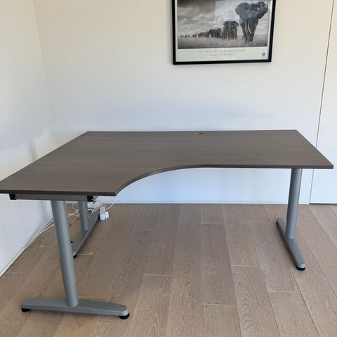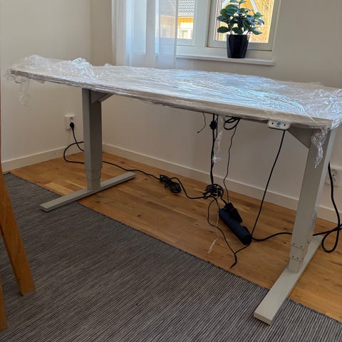 Lång bänkskiva i vit färg. Ytan är slät med en metallfärgad kantlist, där mindre märken och repor kan förekomma. Under bänkskivan finns en metallhållare för exempelvis kablar. Passar som arbetsplats, hobbybord eller skrivbord i hemmet eller på kontor.