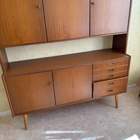Troligen Bertil Fridhagen Bodafors. Bredd 2040 x djup 530 x höjd 1600. Hyllorna är lösa och går att ändra om man så vill.