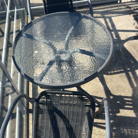 Runt soffbord med skiva i glas och underdel i svart rottinglook. Höjd på bordet när benen är monterade är 35 cm, och diagonalt 73 cm. Till bordet hör monteringsdetaljer enligt bild. Bordsskivan är genomskinlig och underredet är flätat svart.