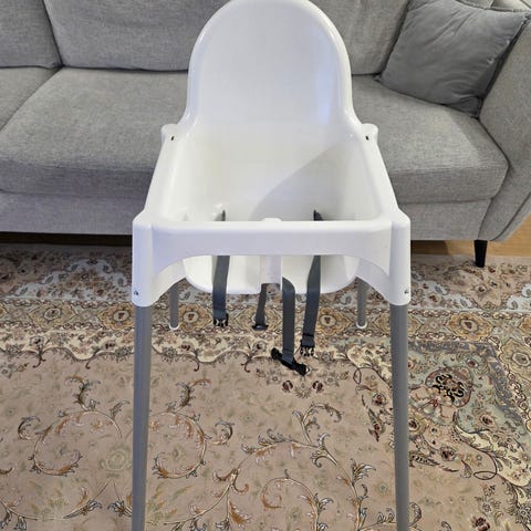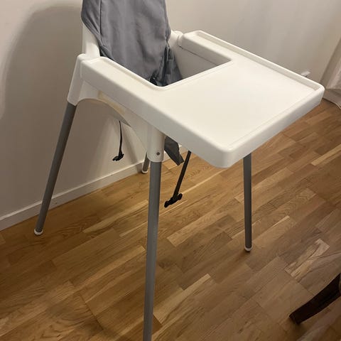 IKEA barnmatstol i vit plast med metallben. Stolen har en integrerad bricka framtill och säkerhetsbälte i sätet. Lämplig för små barn vid matbord eller som fristående matplats. Enkel konstruktion som är lätt att torka av och hålla ren. Hämtas i Spånga